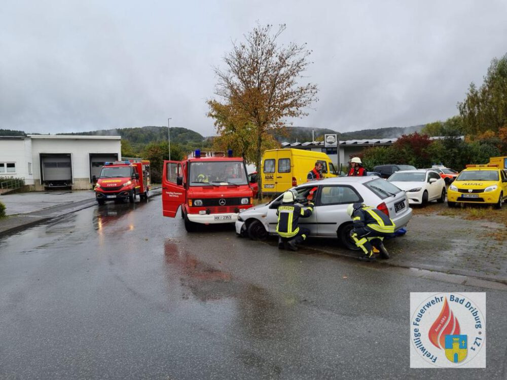 Im Industriegebiet Bad Driburg stießen zwei Fahrzeuge mit drei Personen frontal zusammen, von denen zwei eingeklemmt waren. Vor Ort mussten die Personen betreut werden und gleichzeitig eine Person, die zwischen den beiden PKWs eingeklemmt war, so schnell wie möglich zu retten. Danach musste mit dem Rüstwagen des Löschzuges die eingeklemmte Person schonend aus dem Fahrzeug gerettet werden.