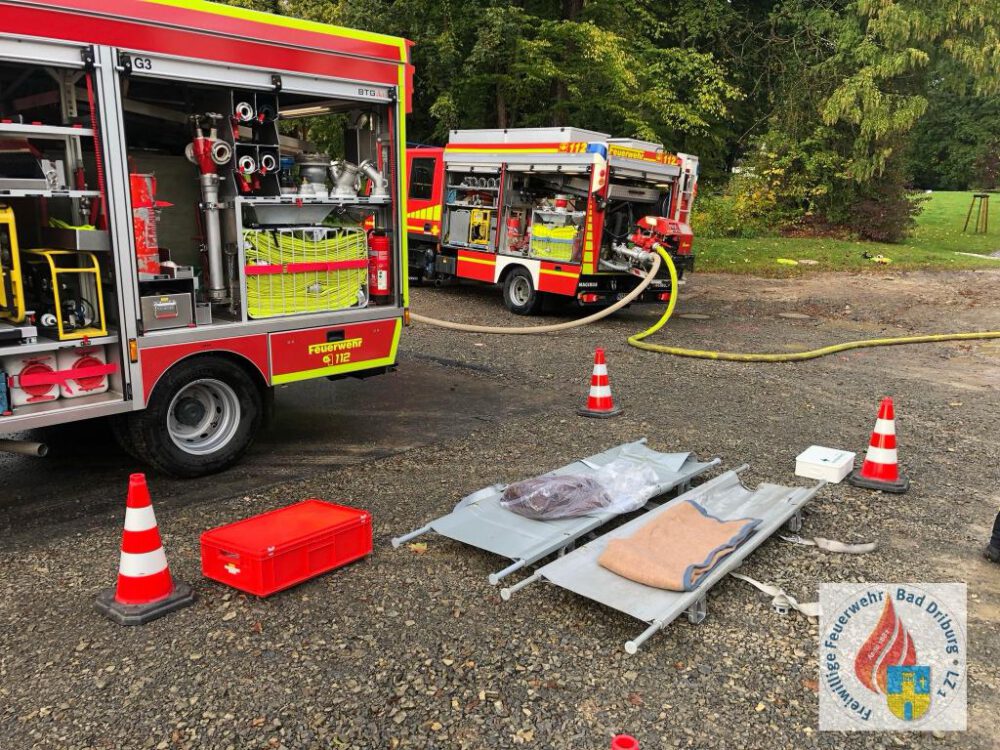 An der ehemaligen Eggelandklinik in Bad Driburg wurde ein Kellerbrand mit einer vermissten Person gemeldet. Vor Ort bestätigte sich die Lage: starke Rauchentwicklung aus dem Treppenhaus und 2 vermisste Personen im Kellerbereich. Bei dieser Übung ging es darum, mit begrenztem Personal möglichst schnell die Personenrettung durchzuführen und das Feuer zu bekämpfen.