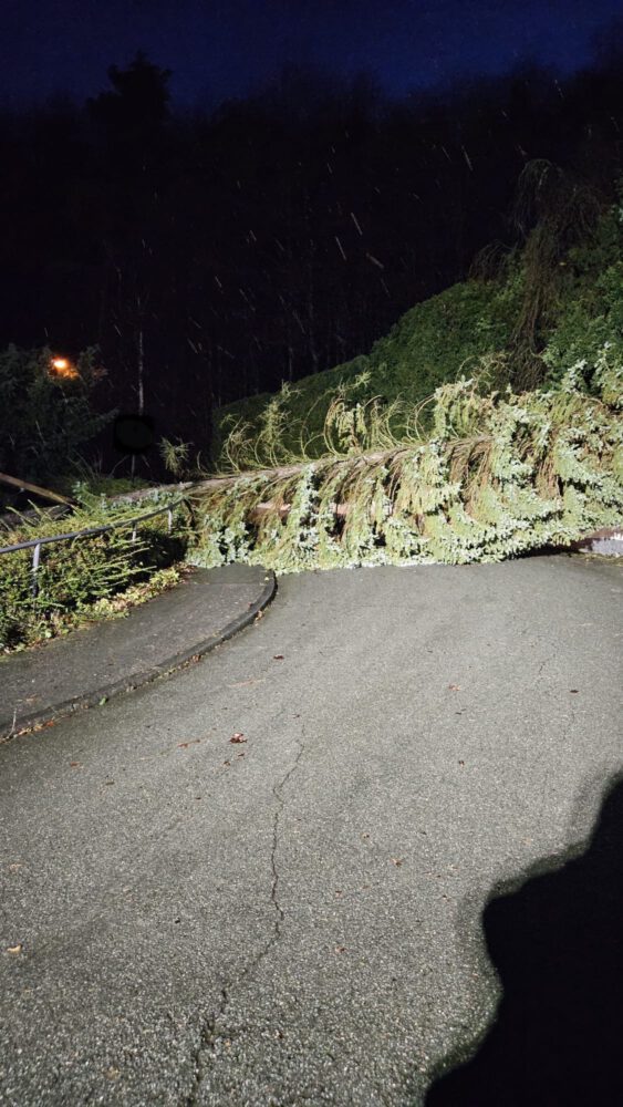Im Anschluss an die Brandmeldeanlage wurde der Löschzug über Funk zu einem Baum auf Fahrbahn alarmiert. Vor Ort versperrte eine umgefallene Tanne die gesamte Fahrbahn. Mittels Kettensäge wurde der Baum entfernt und im Anschluss die Straße gereinigt.